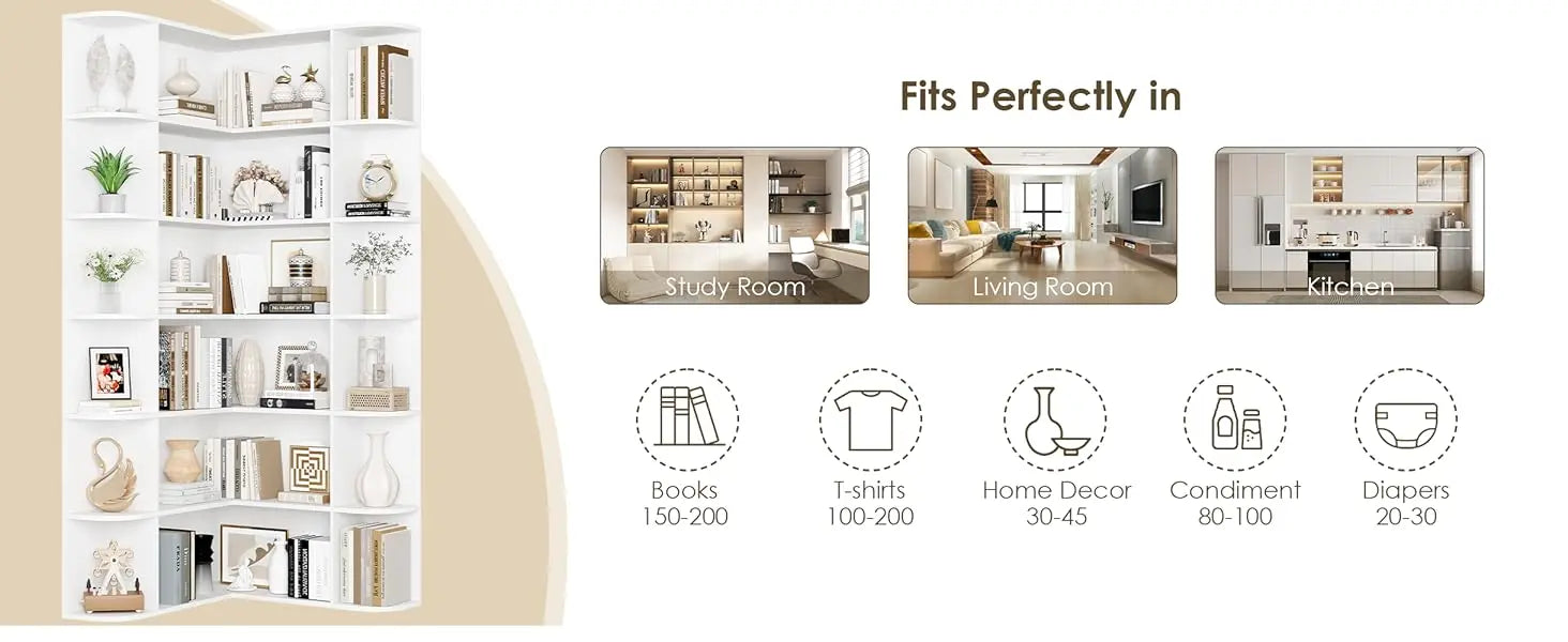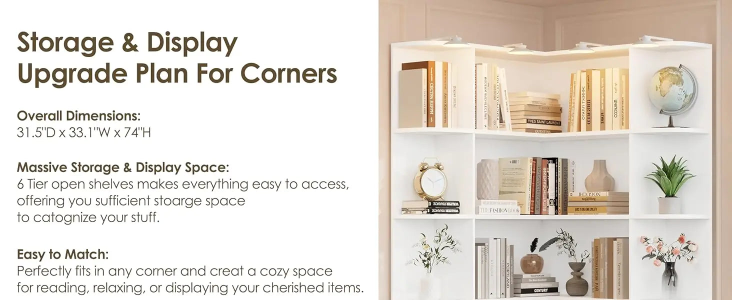 Overall Size 31.5"D x 33.1"W x 73.9H Material Engineered Wood Tiers 6 Tiers Features Corner Storage
